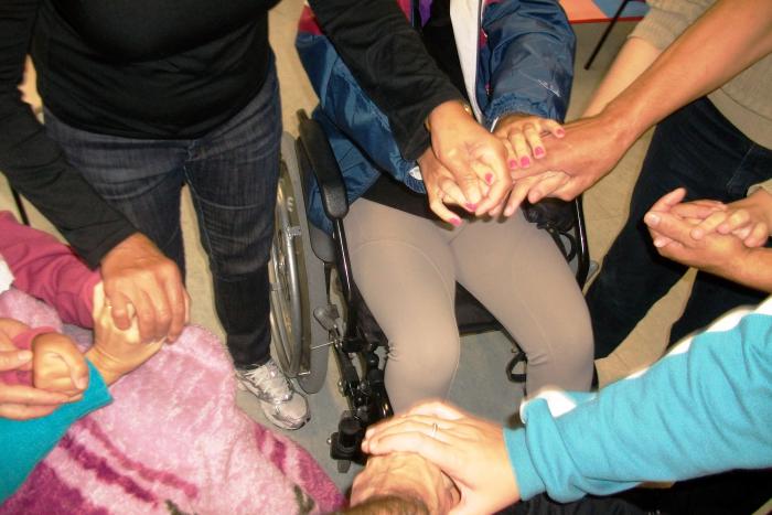 – Gente, vamos bater palmas! – e todos batem palmas.