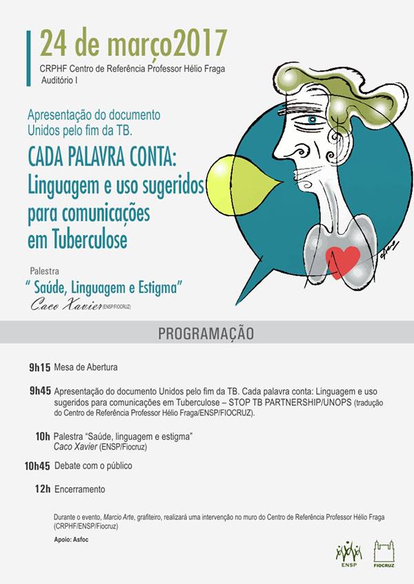 No dia 24 de março, a partir das 9h, no auditório do Centro de Referência Professor Hélio Fraga, haverá a divulgação do documento Unidos pelo fim da TB. Cada palavra conta: Linguagem e uso sugeridos para comunicações em Tuberculose – Stop TB Partnership/Unops, cuja tradução foi feita pelo pesquisador do CRPHF Pablo Dias Fortes. Às 10h acontecerá a palestra Saúde, linguagem e estigma, proferida pelo pesquisador da ENSP, Caco Xavier, que é filósofo e antropólogo. Em seguida será realizado um debate com o público. Durante toda a manhã Marcio Arte, grafiteiro, realizará uma intervenção no muro do Centro de Referência, que será inaugurada no mesmo dia. A intervenção tem o apoio da Asfoc.