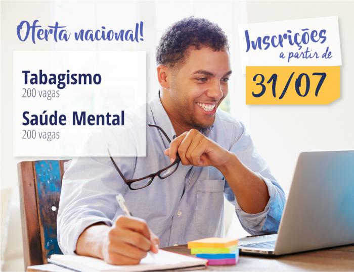 No próximo dia 31 de julho, o Telessaúde SC abrirá inscrições para dois minicursos a distância: (1) Abordagem e tratamento do tabagismo e (2) Saúde Mental na Atenção Primária à Saúde (APS). Ao todo, serão ofertadas 400 vagas voltadas a profissionais de níveis médio e superior da Atenção Básica (os minicursos possuem públicos-alvo diferentes).