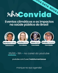 RHS Convida : Eventos climáticos e os impactos na saúde pública do Brasil. Atenção Nova Data 25/03/2026 19h pelo Youtube da RHS https://www.youtube.com/@redehumanizasus Debatedora Mariana Salles Oliveira, Psicóloga (PUC- SP), Editora da RedeHumanizaSUS e sócia da Tranverso Assessoria. Convidada Mirela Pilon Pessatti Arquiteta e urbanista, doutora em Arquitetura, Tecnologia e Cidade (UNICAMP), atua na […]