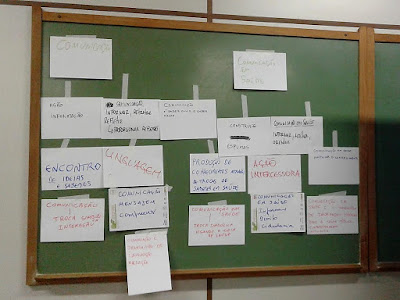 Em seguida, Wilma nos propôs uma segunda dinâmica: cada um escreveu em um pedaço de papel o que entendia por “comunicação” e por “comunicação em saúde”, para sabermos quais os conhecimentos prévios de cada participante. E este foi o resultado: