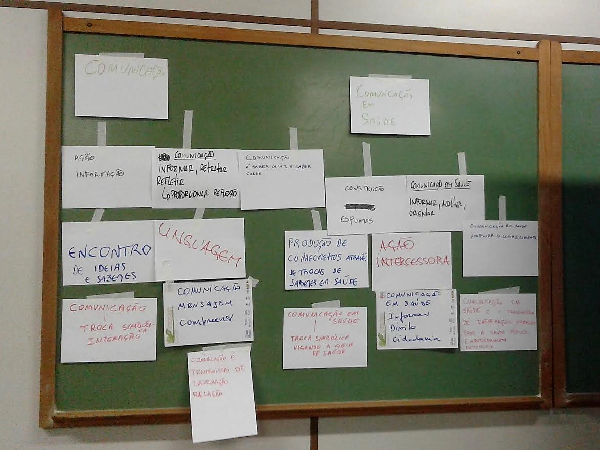 Em seguida, Wilma nos propôs uma segunda dinâmica: cada um escreveu em um pedaço de papel o que entendia por “comunicação” e por “comunicação em saúde”, para sabermos quais os conhecimentos prévios de cada participante. E este foi o resultado: