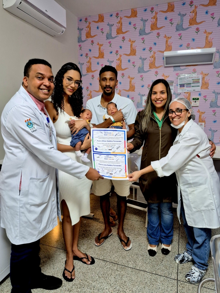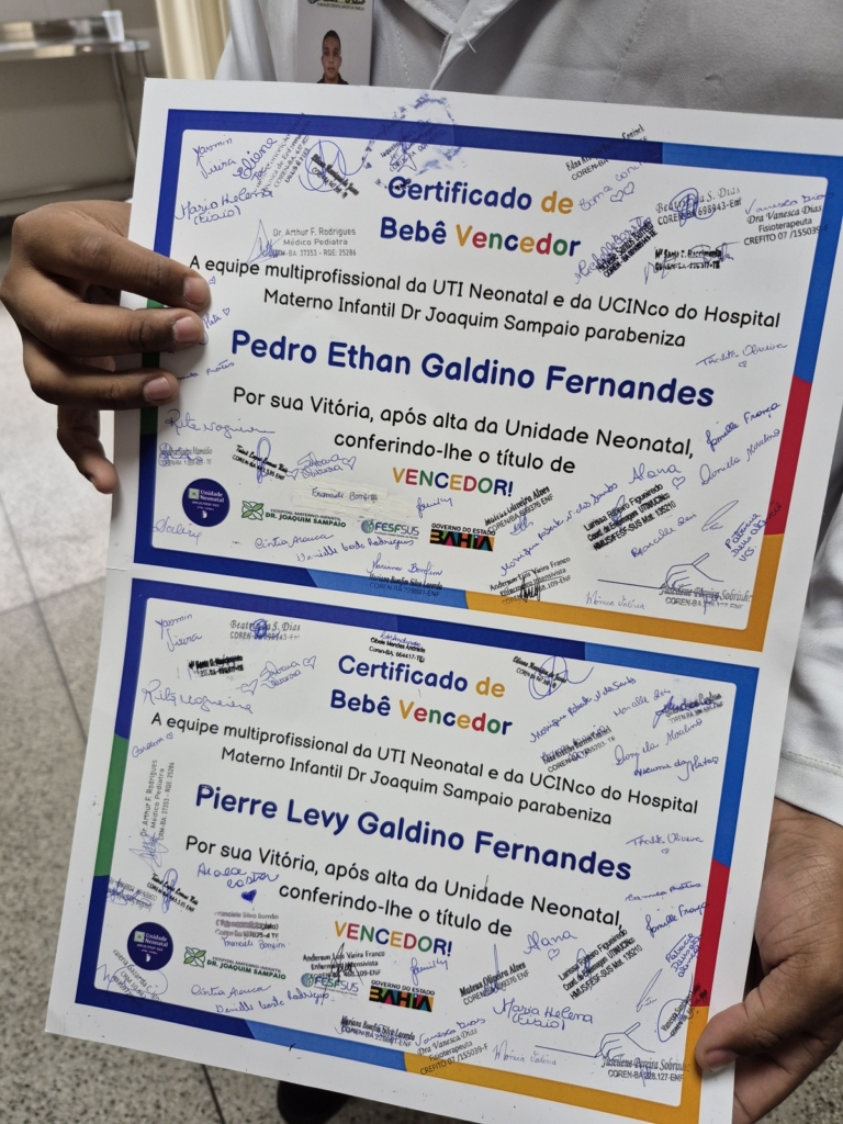 Para os pais, esse período é uma verdadeira montanha-russa emocional. A separação física, a observação do sofrimento do filho, o barulho constante dos aparelhos e a incerteza do futuro geram estresse e ansiedade. No entanto, a UTI também se torna um ambiente de aprendizado e empoderamento. Com apenas 21 anos, Jemima disse que se viu fazendo amizade com mulheres que poderiam até ser sua própria mãe. “Foi a construção do aprender a ser mãe no meio de uma diversidade que a gente nem imagina. Encontrei e fui apoio também”, lembra, emocionada. Ao receber alta, a equipe da UTI Neonatal do HMIJS fez a entrega do Certificado de Bebê Vencedor à família.