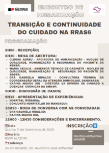 ENCONTRO DE HUMANIZAÇÃO TRANSIÇÃO E CONTINUIDADE DO CUIDADO NA RRAS6 PROGRAMAÇÃO 8H00 – RECEPÇÃO 8H30 – MESA DE ABERTURA: CLEUSA ABREU – APOIADORA DE HUMANIZAÇÃO – NÚCLEO DE QUALIDADE, HUMANIZAÇÃO E SEGURANÇA DO PACIENTE DA SES/SP; MARIA CECILIA – ASSESSOR TÉCNICO DE GABINETE – NÚCLEO DE QUALIDADE, HUMANIZAÇÃO E SEGURANÇA DO PACIENTE DA SES/SP; DRA […]