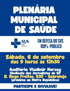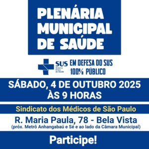 EM DEFESA DA PARTICIPAÇÃO POPULAR E CONTROLE SOCIAL DAS POLÍTICAS PÚBLICAS DE SAÚDE DE SÃO PAULO A coordenação da Plenária Estadual de Saúde de São Paulo e da Plenária Municipal de Saúde de São Paulo vêm apresentar e divulgar esta Carta Aberta sempre em defesa do Sistema Único de Saúde – SUS, dos usuários, profissionais […]