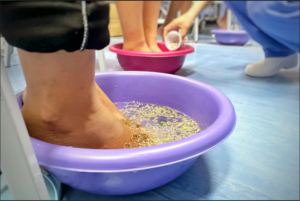 As atividades conduzidas pelo Comitê de Humanização e pela equipe multiprofissional ocorreram em outros três momentos: prática de relaxamento e autocuidado, com a realização de escalda-pés, seguida por auriculoterapia, técnica que utiliza pontos específicos da orelha para aliviar a ansiedade, melhorar a qualidade do sono, estimular a produção de leite e promover equilíbrio emocional.