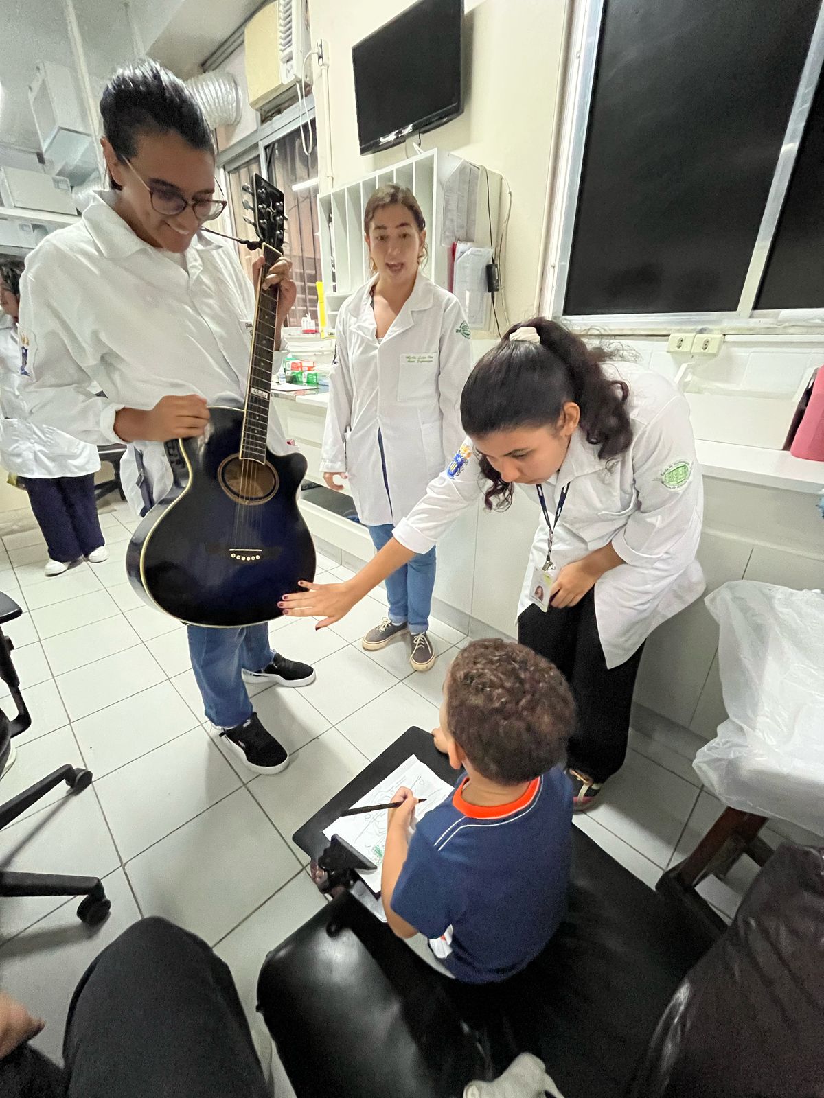 As intervenções beira-leito focaram na promoção da saúde mental e envolveram: escuta ativa para acolhimento e expressão emocional; utilização de cartas com mensagens motivacionais; e uso de instrumento musical, no qual os pacientes escolhiam e cantavam as músicas de sua preferência. Os pacientes só participavam das atividades após consentimento verbal, reforçando sua autonomia.