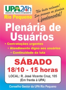Por todos os motivos expostos, convidamos a população do Butantã para a Plenária a ser realizada no sábado, 18/10/2025, às 15 horas, para debatermos a situação e prepararmos uma manifestação, reivindicando a contratação imediata de 52 funcionários para UPA Rio Pequeno!
