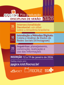 As inscrições para as disciplinas de verão 2026, oferecidas pelo Programa de Pós-Graduação em Informação e Comunicação em Saúde – PPGICS, do Icict/Fiocruz estarão abertas entre os dias 12 e 14 de janeiro. As disciplinas oferecidas são: Interseccionalidade Decolonial: um olhar sobre a Amazônia brasileira – 20 vagas – 02 a 06/2/2026; Introdução a Métodos […]